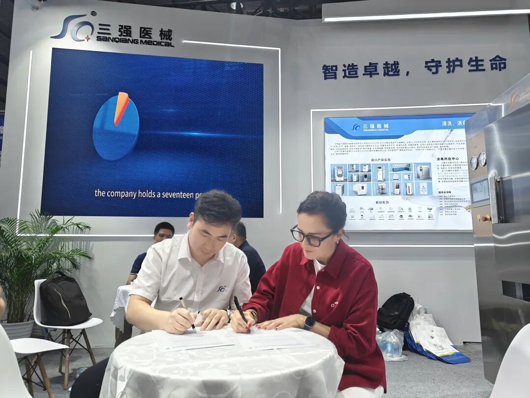 在众多行业伙伴与现场观众的见证下,三强医械与埃塞俄比亚、哥伦比亚的代理客户当场签订合同,实现了展会现场的“开门红”!