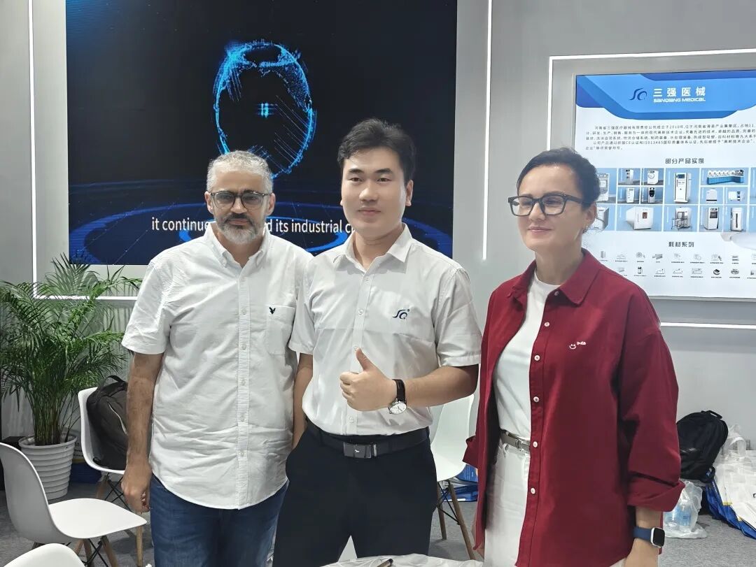 展期内,三强医械的展台始终人流如织,吸引了众多的专业客商驻足咨询、深入洽谈。其中,我们来自埃塞俄比亚与哥伦比亚的合作伙伴,更是